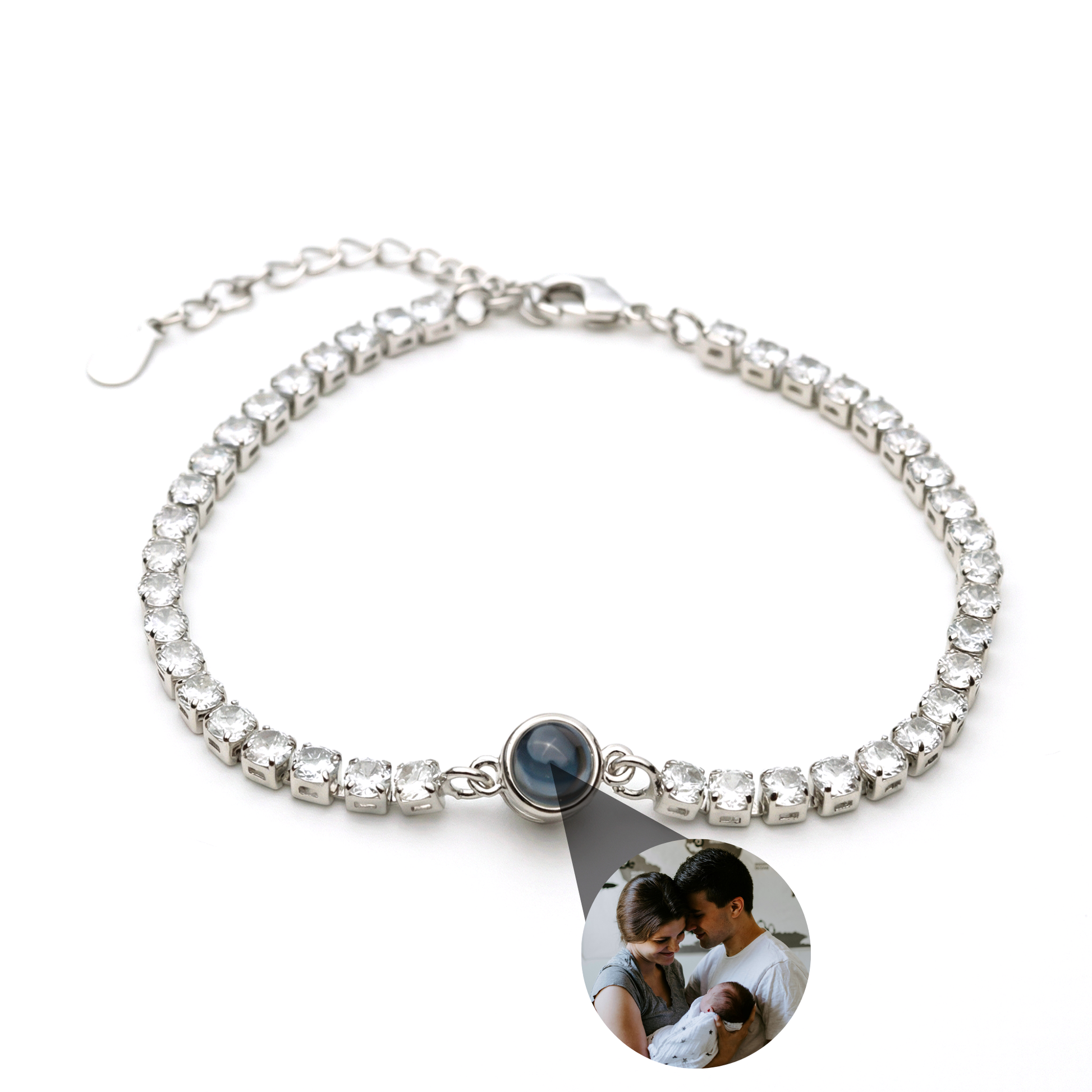 Upptäck vårt exklusiva Tennis Zirconia Fotoarmband — ett smycke som vackert kombinerar elegans med personliga minnen. Det här armbandet är mycket mer än ett accessoar : det berättar din alldeles egna historia.